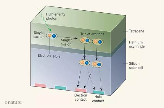 此前人們發(fā)現(xiàn),在并四苯等某些有機(jī)材料里,一個(gè)分子吸收一個(gè)高能光子后,可將部分能量轉(zhuǎn)移給另一個(gè)分子,最終產(chǎn)生兩個(gè)電子,這種現(xiàn)象稱為“單線態(tài)激子裂變”。理論上,在硅電池上覆蓋一層并四苯,就能用一個(gè)高能光子獲得兩個(gè)電子,但如何讓“單線態(tài)激子裂變”產(chǎn)生的兩個(gè)電子轉(zhuǎn)移到硅材料中是一個(gè)關(guān)鍵難題。