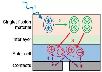在太陽能電池中,光子激發(fā)材料分子釋放電子,產(chǎn)生電流。通常一個(gè)光子只能激發(fā)出一個(gè)電子,高能光子的剩余能量會(huì)以熱量的形式散失。